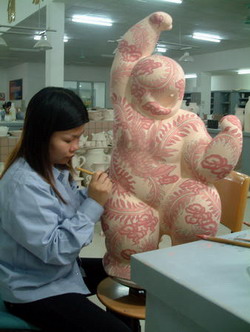關(guān)玉良大師創(chuàng)作的該套陶藝以體育項(xiàng)目動(dòng)作為原型,用夸張的藝術(shù)手法表現(xiàn)人物的特點(diǎn),將推出23種造型、29個(gè)花色共2008個(gè)陶藝人物。目前已有一半完成造型,預(yù)計(jì)至今年5月底全部完成。