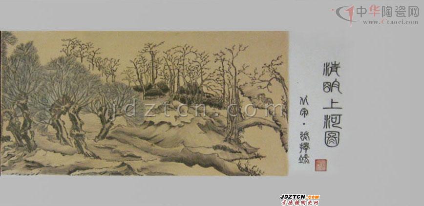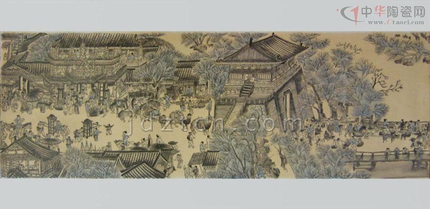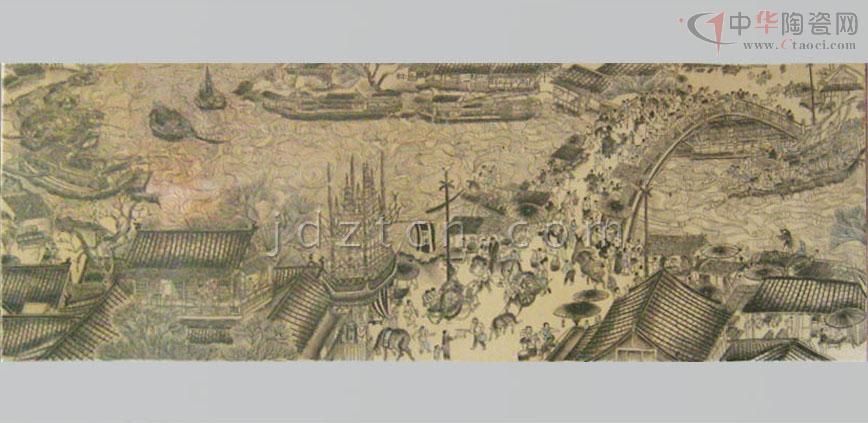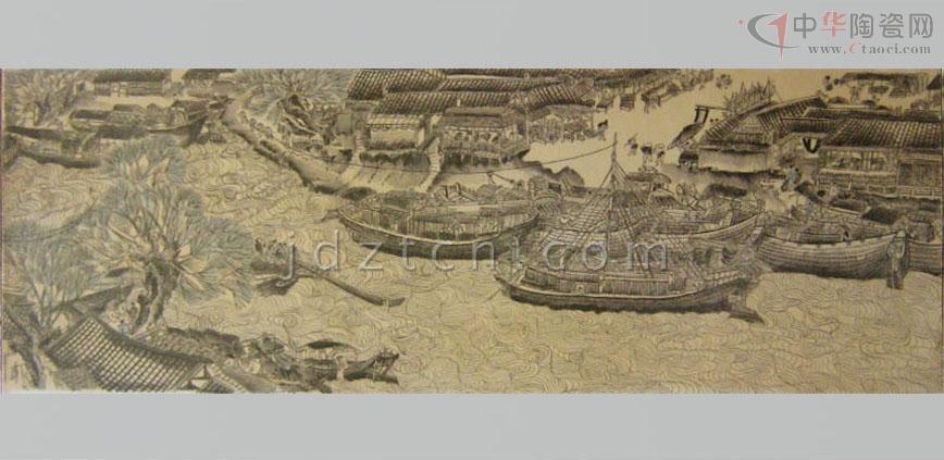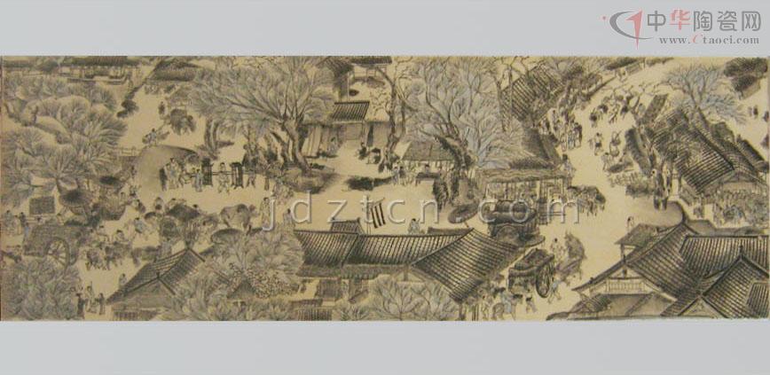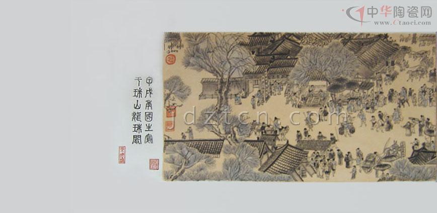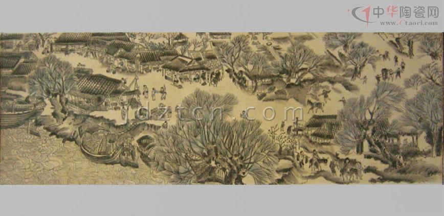 《清明上河圖》瓷板畫創(chuàng)于90年代初,由中國高級工藝美術(shù)師精心設(shè)計(jì)創(chuàng)作歷時14月,經(jīng)1200攝氏度窯火、兩遍780攝氏度爐火燒制而成?偢55厘米、長545厘米,于原圖按1:1的比例繪制,由七塊煤窯瓷板拼制而成,以墨彩描繪,形象準(zhǔn)確生動,用筆細(xì)膩精致,色調(diào)濃淡多變,表現(xiàn)出瓷、畫交融一體的意境。 瓷板畫既是瓷,又是畫。它是陶瓷藝術(shù)擺脫工藝裝飾、融入文人繪畫而形成的陶瓷門類;作為一種獨(dú)立的繪畫形式在清代嘉慶、道光年間已是非常流行。煤窯瓷板擺脫了瓷板匣缽大小及生產(chǎn)工藝限制,而墨彩是用黑色彩料在瓷胎釉面上繪畫,再入爐烘烤,色料經(jīng)久不脫落;繼承了前期“琺瑯墨彩”的審美特征和風(fēng)格,繪成景物烘烤后的色澤滋潤柔和,渲染的層次豐富細(xì)膩、濃淡有度,描繪出微妙的神情;表現(xiàn)了作品的意韻。 《清明上河圖》畫卷,北宋風(fēng)俗畫作品,作者張擇端。傳世名作、一級國寶。原作現(xiàn)藏北京故宮博物院。 《清明上河圖》瓷板畫記錄了北宋末葉、徽宗時代首都汴京(今開封)郊區(qū)和城內(nèi)汴河兩岸的建筑和民生。該圖描繪了清明時節(jié),北宋京城汴梁以及汴河兩岸的繁華景象和自然風(fēng)光。作品以長卷形式,采 用散點(diǎn)透視的構(gòu)圖法,將繁雜的景物納入統(tǒng)一而富于變化的畫面中,畫中人物500多,衣著不同,神情各異,其間穿插各種活動,注重戲劇性,構(gòu)圖疏密有致,注重節(jié)奏感和韻律的變化,筆墨章法都很巧妙。分為三個段落: 首段,汴京郊野的春光: 在疏林薄霧中,掩映著幾家茅舍、草橋、流水、老樹、扁舟。兩個腳夫趕著五匹馱炭的毛驢,向城市走來。一片柳林,枝頭剛剛泛出嫩綠,使人感到雖是春寒料峭,卻已大地回春。路上一頂轎子,內(nèi)坐一位婦人。轎頂裝飾著楊柳雜花,轎后跟隨著騎馬的、挑擔(dān)的,從京郊踏青掃墓歸來。環(huán)境和人物的描寫,點(diǎn)出了清明時節(jié)的特定時間和風(fēng)俗,為全畫展開了序幕。 中段,繁忙的汴河碼頭:汴河是北宋國家漕運(yùn)樞紐,商業(yè)交通要道,從畫面上可以看到人煙稠密,糧船云集,人們有在茶館休息的,有在看相算命的,有在飯鋪進(jìn)餐的。還有"王家紙馬店",是掃墓賣祭品的,河里船只往來,首尾相接,或纖夫牽拉,或船夫搖櫓,有的滿載貨物,逆流而上,有的靠岸停泊,正緊張地卸貨。橫跨汴河上的是一座規(guī)模宏大的木質(zhì)拱橋,它結(jié)構(gòu)精巧,形式優(yōu)美。宛如飛虹,故名虹橋。有一只大船正待過橋。船夫們有用竹竿撐的;有用長竿鉤住橋梁的;有用麻繩挽住船的;還有幾人忙著放下桅桿,以便船只通過。鄰船的人也在指指點(diǎn)點(diǎn)地象在大聲吆喝著什么。船里船外都在為此船過橋而忙碌著。橋上的人,也伸頭探腦地在為過船的緊張情景捏了一把汗。這里是名聞遐邇的虹橋碼頭區(qū),車水馬龍,熙熙攘攘,名副其實(shí)地是一個水陸交通的會合點(diǎn)。 后段,熱鬧的市區(qū)街道:以高大的城樓為中心,兩邊的屋宇鱗次櫛比,有茶坊、酒肆、腳店、肉鋪、廟宇、公廨等等。商店中有綾羅綢緞、珠寶香料、香火紙馬等的專門經(jīng)營,此外尚有醫(yī)藥門診,大車修理、看相算命、修面整容,各行各業(yè),應(yīng)有盡有,大的商店門首還扎“彩樓歡門”,懸掛市招旗幟,招攬生意,街市行人,摩肩接踵,川流不息,有做生意的商賈,有看街景的士紳,有騎馬的官吏,有叫賣的小販,有乘座轎子的大家眷屬,有身負(fù)背簍的行腳僧人,有問路的外鄉(xiāng)游客,有聽說書的街巷小兒,有酒樓中狂飲的豪門子弟,有城邊行乞的殘疾老人,男女老幼,士農(nóng)工商,三教九流,無所不備。交通運(yùn)載工具:有轎子、駱駝、牛馬車、人力車,有太平車、平頭車,形形色色,樣樣俱全。繪色繪形地展現(xiàn)在人們的眼前。 總計(jì)在五米多長的畫卷里,共繪了五百五十多個各色人物,牛、馬、騾、驢等牲畜五、六十匹,車、橋二十多輛,大小船只二十多艘。房屋、橋梁、城樓等也各有特色,體現(xiàn)了宋代建筑的特征。