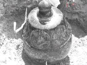 這處釉陶和尚“甕罐葬” 位于浬浦村寶掌山大巖寺旁邊,是該村村民在挖地基時發(fā)現(xiàn)的。當(dāng)時村民挖出來一個上下二只倒扣的甕罐,高約1.5米,釉陶甕罐表面的正中間有兩個對稱的“壽”字,“壽”兩邊各有兩只仙鶴,下邊是一只麒麟,整幅圖案線條流暢,色彩明麗。我市文化部門聞訊后趕到現(xiàn)場,發(fā)現(xiàn)這個漂亮的釉陶甕罐就是和尚的“甕罐葬”。