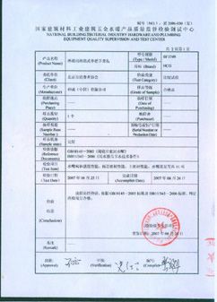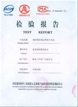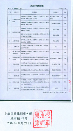 本律師受和成(中國)有限公司委托,代表和成(中國)有限公司鄭重聲明如下: 和成(中國)有限公司生產(chǎn)的“HCG”牌BF3749淋浴用掛墻式單把手龍頭在2007年6月26日已經(jīng)過國家建筑材料工業(yè)建筑五金水暖產(chǎn)品質(zhì)量監(jiān)督檢驗測試中心復(fù)檢合格。檢測報告書如下: