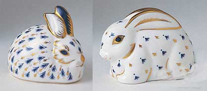 故事可以追溯到1970年末,當(dāng)時(shí)Royal Crown Derby的設(shè)計(jì)總監(jiān)Jo Ledger首先想到將Royal Crown Derby最經(jīng)典的伊萬里風(fēng)格圖案用在造型簡單的小雕像上,進(jìn)而開發(fā)出鎮(zhèn)紙系列。這個(gè)系列推出的第一批鎮(zhèn)紙是“Five Birds and a Rabbit”(五只鳥和一只野兔),現(xiàn)在很多新推出的設(shè)計(jì)仍能在它們身上找到影子。這六件最初的鎮(zhèn)紙現(xiàn)在唯有22K純金描繪的“Rabbit”仍在生產(chǎn),其他已經(jīng)絕版。Royal Crown Derby沿用這只野兔造型創(chuàng)作出了一只白金鎮(zhèn)紙用以慶祝鎮(zhèn)紙系列25周年銀色華誕。后來經(jīng)過設(shè)計(jì)師們討論,沒有Baby對兔媽媽來說是不公平的,所以就有了大家現(xiàn)在看到的Rabbit母子鎮(zhèn)紙,鈷藍(lán)色和白金色結(jié)合的完美設(shè)計(jì)帶來一種出乎意料的視覺感受。