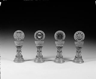 粉彩蓮座托八吉祥:大清嘉慶年制,高20.5cm,是佛堂里的供器,品種以景泰藍(lán)為多,像這種粉彩的瓷器十分少見(jiàn)。“八吉祥”指8種佛教法物,即輪、螺、傘、幢、花、罐、魚(yú)、腸。這套瓷塑里的每一件法物都被制成兩面對(duì)稱的鏤空雕塑。