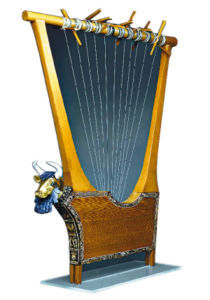 這個(gè)豎琴是在普阿比王后陵墓中發(fā)掘的物品之一。豎琴出土?xí)r本身的木質(zhì)已腐朽,經(jīng)過處理得以保存。共鳴箱上鑲有青金石、貝殼和紅石灰?guī)r。