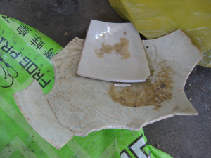 找到據(jù)說(shuō)是挖出了宋代陶瓷的村民溫學(xué)勤時(shí),他從家中拎出了一個(gè)小編織袋來(lái)到門(mén)口。從中拿出幾個(gè)陶瓷殘器后,將里面的碎片一并倒出,里面共有16件殘器和許多碎片。