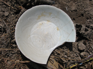 這些陶瓷殘器和碎片,有碗、盤(pán)、碟、盞等,精粗不一,釉色和器型各異,精細(xì)的胎質(zhì)細(xì)膩,還有劃花裝飾,有的底下有墨書(shū)的字符,以精細(xì)的占多數(shù)。蔡昌振在仔細(xì)翻檢觀看后認(rèn)為,陶瓷殘器和碎片確實(shí)是宋代的,大多為北宋時(shí)期。且從精細(xì)程度看,這些瓷器并非本地生產(chǎn),而是出自北方及福建等地,在當(dāng)時(shí),普通人家是用不起的,應(yīng)為官宦人家所用。