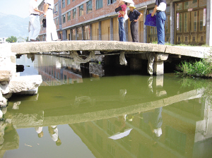 毛昌逵說(shuō):古時(shí)候,鰲江自蓋竹村前經(jīng)過(guò)。自鰲江上岸,走過(guò)虹橋,就進(jìn)入了蓋竹。如今虹橋還在,只是改成了可通汽車(chē)的鋼筋水泥橋了,橋前方的鰲江更是大幅度地改道南移。毛昌逵說(shuō),在解放后平整土地時(shí),他們挖到了街區(qū)的遺址,規(guī)模這么大,想當(dāng)年這里應(yīng)該十分繁華。