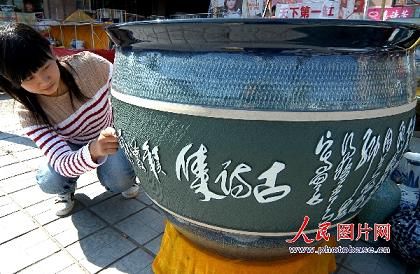 10月8日,一口需要5個大人才能抬動,標價36萬元的天下第一缸,在江蘇連云港市新浦隴海步行街對外展示。 據(jù)悉,這口大缸是由江西景德鎮(zhèn)老五瓷廠高級工藝師設(shè)計燒制,高80公分、直徑95公分,采用多種工藝燒制而成,缸體色澤鮮亮,刻有草書詩詞,讓觀者看后嘖嘖稱絕。