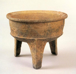 鼎是古代傳統(tǒng)的炊器,綿延使用數(shù)千年。這件鼎形制厚重龐大,寬口沿外折,可承蓋。直壁深腹,圜底下殘留黑色的炊煮痕跡。鼎的足部設(shè)計非常有特色,剖面呈直角曲尺形,具備優(yōu)良的承重性能。