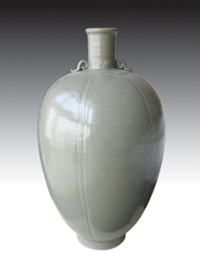 晚唐詩(shī)人陸龜蒙在《秘色越器詩(shī)》中贊美越窯瓷器的釉色為:“九秋風(fēng)露越窯開(kāi),奪得千峰翠色來(lái)”。越瓷的釉色以青為主,青中帶灰,形成特有的“艾葉色”,晶瑩潤(rùn)澤。越窯創(chuàng)燒于唐朝至五代時(shí)期,燒制技術(shù)至宋朝已達(dá)到爐火純青的地步了。 在當(dāng)時(shí)的吳越一帶,即現(xiàn)在浙江的余姚、上虞、諸暨等地出現(xiàn)了大量的越窯古窯址,這表明了盛唐政治安定,經(jīng)濟(jì)繁榮,制瓷業(yè)興盛。從五代 公元907 960年 起,制瓷業(yè)開(kāi)始設(shè)立“御窯”即“官窯”,產(chǎn)品專(zhuān)供宮廷使用,越窯瓷器作為御用的也稱(chēng)為秘色瓷,宋人曾慥《高齋漫錄》說(shuō):“吳越秘色窯,越州燒進(jìn),為供奉之物,臣庶不得用,故云秘色”。秘色實(shí)即還原焰經(jīng)1300℃高溫?zé)傻模陨此^艾青、湖綠、翠青的“千峰翠”色。 本件藏品是一件五代越窯瓜棱云紋雙系梅瓶,瓶高31厘米。梅瓶是古代的儲(chǔ)酒器,釉色為典型的艾青色,通體施釉,圈足支燒,底部陰刻“內(nèi)”字(見(jiàn)圖),可見(jiàn)這件作品是當(dāng)時(shí)供“內(nèi)府”使用的官窯器。整件梅瓶刻有六條瓜棱線,并在瓶體上以本色釉劃刻六朵飄帶立云紋,瓶肩部塑二圓孔,便于穿繩系帶,瓶口外卷,亭亭玉立,美不勝收。五代梅瓶與后世梅瓶稍有不同的是口頸稍長(zhǎng)、肩腹較寬,并帶有雙系,這是梅瓶初創(chuàng)時(shí)期的特征,不過(guò)那時(shí)這種作為酒具的窯器,不稱(chēng)梅瓶,而叫酒經(jīng)、經(jīng)瓶,至晚清“梅瓶”稱(chēng)謂才出現(xiàn),因其小口僅能容納一枝梅而得名。 2005年,紐約蘇富比拍賣(mài)公司秋拍,曾以46.04萬(wàn)美元,拍出了一件器高39厘米的五代越窯刻花帶蓋梅瓶,得主是臺(tái)灣私人收藏家,刻花圖案也是飄帶立云紋。由此可見(jiàn)梅瓶因其精湛的工藝以及獨(dú)特的人文價(jià)值,給人以極高的藝術(shù)享受,是收藏拍賣(mài)市場(chǎng)的寵兒。