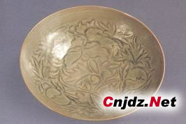 這件北宋刻花牡丹紋碗,高7.5厘米,口徑23.3厘米,底徑6厘米。敞口,弧腹,圈足,足削修規(guī)整,足底露胎,胎呈灰褐色,胎質(zhì)堅密。碗內(nèi)刻花,一周弦紋下刻纏枝牡丹花葉紋,一花盛開,二蕾含苞待放,花葉上均劃出葉脈。該碗刀鋒犀利、瀟灑,深淺有致。牡丹花繁而不亂,既追求了形式變化,又能保持整體的和諧統(tǒng)一;ü谪S滿,花葉分披,花枝纏繞,奔放流暢,給人以欣欣向榮之感。通體施以青釉,釉色青中閃黃,花紋清晰,濃淡相間,紋樣微凸,具有很好的視覺效果。牡丹花在中國傳統(tǒng)文化中寓意著富貴,器物上飾纏枝牡丹是耀州窯北宋中期最為盛行的題材,該碗當(dāng)為耀州窯鼎盛時期之作,代表了耀州窯刻花青瓷燒造的最高水平。     此碗現(xiàn)藏于甘肅省博物館。