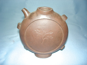 此紫砂四系壺高度為12厘米,口徑為2.5厘米,形狀扁圓,壺嘴置于壺肩處,短小略彎,與壺口齊平,壺身兩邊有四半圓形環(huán),為系繩之用,下部橢圓為底托,十分平穩(wěn),底托之中有孔相通,用繩穿出經(jīng)過四系將壺整個(gè)兜起來,背在身上攜帶方便。     此器構(gòu)思看似簡單,但使用起來極其合理。用料泥色深紫,裝飾印模,壺身一面一枝花卉,有明代遺風(fēng)。此壺缺蓋,因使用時(shí)將酒灌滿,行動(dòng)時(shí)為不使酒滿潑灑,乃使用木塞一塞,方便實(shí)用,久之,無蓋亦屬正常。