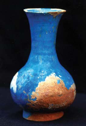 閩北私人收藏有一件“明代孔雀綠釉玉壺春瓶”(見(jiàn)圖)。該瓶高9厘米,口徑3.6厘米,腹徑5.5厘米,足徑3.5厘米。瓶的腹部和頸部可見(jiàn)兩道接痕,為三段坯胎制作。該瓶具有元瓷的某些特征,圈足外撇,足內(nèi)露胎,足端平切,內(nèi)見(jiàn)旋削痕和中心突起。瓶?jī)?nèi)口沿及外壁施滿(mǎn)孔雀綠釉,因年久風(fēng)化和土壤侵蝕,瓶體部分成片剝釉,內(nèi)見(jiàn)光滑素?zé)凉ィ梢?jiàn)文獻(xiàn)所言為二次入窯燒成,所言不虛。