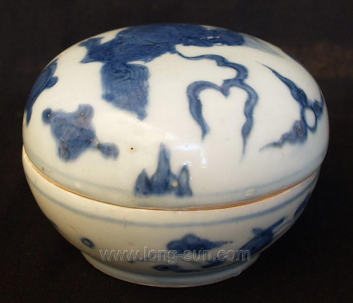 這是一個明代嘉靖時期的青花麒麟圖粉盒,盒蓋上畫的是一只麒麟,麒麟周圍繪火云和雜寶紋。麒麟與鳳、龍、龜并稱為"四靈",麒麟為"四靈"之首,是古代常見的瓷畫題材。元明時期麒麟通常畫作馬頭(也有畫作牛頭或虎頭)、鹿角、麟身、牛蹄、馬尾。這個粉盒紋飾吉祥、形制規(guī)整、畫工、青花發(fā)色、胎釉都具有典型的時代特征,是一件不錯的把玩收藏品。瓷器釉色為蛋清釉。