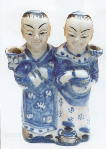 高27.5厘米,為傳統(tǒng)的“和合二仙”。造型概括,眉眼構(gòu)畫(huà)生動(dòng)。此件小型瓷塑是用來(lái)插香之用的。