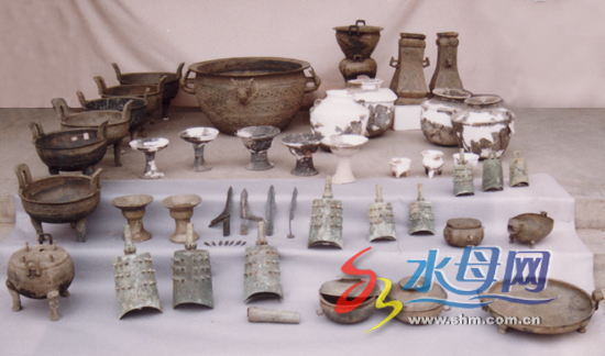 1994年海陽嘴子前墓群4號(hào)墓出土的大批青銅器。