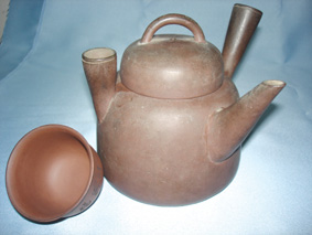 此壺制作年代約為晚清至民國。 壺身圓筒,下部略大,以顯示出器型穩(wěn)健,整體卻與宜興傳統(tǒng)紫砂壺的制法不同:其一、壺為直把,高于壺身,與半圈形壺鈕持平,高度為14厘米。其二、在壺把的對稱處豎有一漏斗形注水管,可將水直接注入壺中。三、壺蓋高鼓半圈,蓋內(nèi)無沿口,使用時是將壺罩上。壺內(nèi)沿口有一杯放入壺身?赡苡糜跍鼐、溫茶或溫參膏補藥之用。