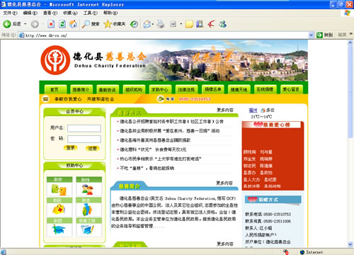 為支持慈善事業(yè),今年8月,網(wǎng)興網(wǎng)絡(luò)正式與德化縣慈善總會(huì)洽談決定,由網(wǎng)興網(wǎng)絡(luò)科技建設(shè)德化縣慈善總會(huì)官方網(wǎng)站,為德化縣慈善總會(huì)提供網(wǎng)絡(luò)技術(shù)支持。 2007年11月1日,德化縣慈善總會(huì)網(wǎng)站已正式上線開通。 德化縣慈善總會(huì)網(wǎng)站縮略圖 德化縣慈善總會(huì)網(wǎng)址:http://www.dhcszh.com