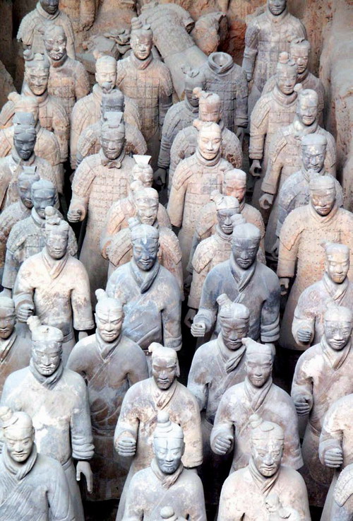 陶經(jīng)過了從灰陶、黑陶、白陶到印紋硬陶、彩陶的發(fā)展變化之路,在陶器的造型上也經(jīng)歷了由簡單到復(fù)雜、由粗放到精細(xì)、由平淡到生動的漸進(jìn)過程。早期陶最負(fù)盛名的作品之一是出土于陜西臨潼秦始皇陵陪葬坑的兵馬俑,也叫秦俑。秦俑位于陜西臨潼附近,是秦始皇陵的一部分。自1974年開始,迄今已發(fā)掘了呈品字排列的三個俑坑,出土了真人大小的兵馬俑6000余個,其中有活馬大小的陶馬30余匹,戰(zhàn)車100余乘,組成了規(guī)模宏大的秦俑博物館。一號坑規(guī)模最大,長230米,寬62米,深5米,面積達(dá)14260平方米,是主力步兵戰(zhàn)陣,排列著一個一個整齊威武的軍隊方陣,間有雄健高大的戰(zhàn)馬。陶俑有士兵、馭手、鎧甲軍士、軍官、將軍,姿勢有立姿、跪射姿。二號坑略小,是騎兵戰(zhàn)陣,有戰(zhàn)車上千輛。三號坑最小,僅有六七十個軍官和將軍俑,似為指揮部。這些兵馬俑做工極其精良,須發(fā)畢現(xiàn),面部表情生動,姿態(tài)自然,衣紋流暢,顯示出嚴(yán)肅剛強(qiáng)、器宇軒昂的神態(tài),戰(zhàn)馬也敦實有力、蓄勢待發(fā)。這形象地證明了當(dāng)時中國陶瓷技術(shù)達(dá)到了何等卓越的水平!這是一支為秦始皇死后護(hù)衛(wèi)的冥軍,為了建造它,老百姓付出了慘痛的代價,但是也為我們留下了這舉世矚目的珍寶,被譽(yù)為“世界第八大奇跡”!現(xiàn)任法國總統(tǒng)、當(dāng)時的總理希拉克說:“不見金字塔,就不算到過埃及;不見兵馬俑,就不算到過中國!”