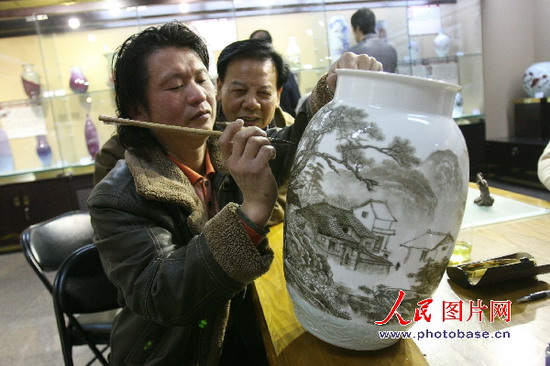 12月6日,來自江西景德鎮(zhèn)高級工藝美術(shù)師劉敏現(xiàn)場進(jìn)行瓷繪表演。 版權(quán)作品,請勿轉(zhuǎn)載。