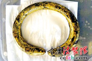 描述:數量為一對,質地為鎏金龍紋金手鐲,出水后仍顯黃金本色,只有手鐲的兩頭接口處部分呈氧化后的黑色。該手鐲重達4兩,直徑約11厘米,龍形花紋有中國傳統特色。