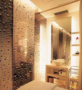 燈光:作為HOME SPA,比一般浴室的燈光設(shè)計(jì)要更細(xì)致。洗浴空間的燈光要柔和、均勻,光源本身還要有防水散熱的功能和不易積水的結(jié)構(gòu)。面部整理空間對照度和光線角度要求相對比較高,照明燈具最好是安在化妝鏡的兩邊,其次是頂部,另外還要考慮架設(shè)背景光源,以增加氣氛。