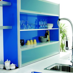 中柜使用上下玻璃移門,使廚房物品收放自如,漂亮物件不妨展示出來,其他東西玻璃擋住可以防塵。