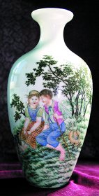 這件琺瑯彩瓷瓶高22厘米,口徑5.5厘米,底徑5厘米,薄胎,小盤(pán)口,釉色極其細(xì)膩光潤(rùn),并繪有一對(duì)西洋風(fēng)格的少男少女,顏色自然瑩潤(rùn)。據(jù)鑒定專家介紹,琺瑯彩吸取了景泰藍(lán)制作的方法,在瓷質(zhì)的胎上,用各種琺瑯彩料描繪而成的一種釉上彩瓷,亦稱“瓷胎畫(huà)琺瑯”,m瑯彩瓷的特點(diǎn)是瓷質(zhì)細(xì)潤(rùn),彩料凝重,色澤鮮艷明麗,畫(huà)工精致,m瑯彩于清代康熙中期燒制成功,至雍正時(shí),得到進(jìn)一步發(fā)展。雍正六年以后采用宮廷自己配制的彩料,色彩更加豐富,但雍正時(shí)期的傳世品多藏于故宮博物院內(nèi)。乾隆時(shí)期的琺瑯彩也很精致,除了白地琺瑯彩之外,還流行色地開(kāi)光,圖案多繪有山水人物、花鳥(niǎo)紋、西洋婦女等,特別是人物像西洋油畫(huà)一樣富有立體感。后由于制作這種琺瑯彩瓷器極度費(fèi)工,因此乾隆以后就銷聲匿跡了。