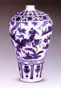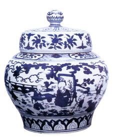 明代前就已設(shè)立御窯廠,洪武二年政府就規(guī)定“祭器皆用瓷”。在對(duì)外入貢國(guó)的答贈(zèng)中,也需要大量瓷器,洪武七年就一次性賜贈(zèng)琉球瓷器七萬件?梢姰(dāng)時(shí)的瓷器生產(chǎn)量如此之大。洪武時(shí)期,青花色調(diào)略發(fā)灰,呈淡青色,主要是用的國(guó)產(chǎn)青花釉料,部分是元代留下的進(jìn)口青花釉料。1964年南京故宮出土的瓷器中,有一部分是洪武時(shí)期的制品。其中有一件官窯青花云龍紋盤,外壁繪青花云龍,里壁模印,盤心畫如意云三朵?傊髑嗷ù杀仍嗷ǜ邪l(fā)展,在產(chǎn)量和質(zhì)量方面都突破元代。永樂、宣德時(shí)期經(jīng)過三十多年的發(fā)展,青花瓷已達(dá)到又一高,這一時(shí)期的青花瓷,胎骨堅(jiān)、釉精細(xì)、青花濃 艷、造型多樣和花紋優(yōu)美而負(fù)盛名,被世人稱我國(guó)青花瓷器的黃金時(shí)代。永、宣時(shí)期采用的青花料有三種:一是進(jìn)口釉料,色澤鮮艷,帶有黑色鐵銹斑點(diǎn),產(chǎn)地來自南洋的“蘇泥勃青”,據(jù)說是由鄭和出洋帶回來的鈷土礦,含氧化鐵較多。二是國(guó)產(chǎn)料,青花較深為藍(lán)色,比較柔和,多用于民窯產(chǎn)品。三是進(jìn)口料和國(guó)產(chǎn)料混合使用,各取所長(zhǎng),進(jìn)口料容易暈散、流淌,多用于寫意畫面,比如繪畫庭院嬰戲,畫庭院用進(jìn)口青花料、畫人物用國(guó)產(chǎn)青花料,這樣巧妙結(jié)合層次分明,藝術(shù)效果較好。這個(gè)時(shí)期青花瓷器的鐵銹斑,永樂時(shí)期出現(xiàn)多,宣德時(shí)期比較少。永、宣時(shí)期的青花大盤較多,繪畫內(nèi)容常見的有纏枝花卉、一束蓮、多為砂底,有小點(diǎn)火石紅斑。這時(shí)期也生產(chǎn)一些其它器如永樂年制造壓手杯,中心畫雙獅滾球,還有玉壺春瓶、梅瓶、貫耳瓶、高足碗、蓋碗等青花器。