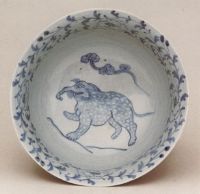 說 明: 撇口,深腹,圈足。內(nèi)外釉下均繪青花,青花色澤青中略偏灰色。