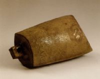 說(shuō) 明: 此鐘為仿青銅鈕鐘造型。器外通體施釉,釉色青偏黃。施釉不均,且有流釉。