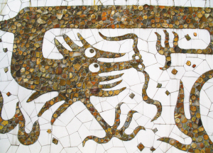 梅文鼎大師用采自貝丘遺址、奇石古窯址和南風(fēng)古灶窯址的陶片砌成的壁畫《瑞龍獻(xiàn)寶》。本報(bào)記者 周春 攝