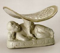 定窯白釉銅子擎荷赭彩雕劃牡丹紋枕