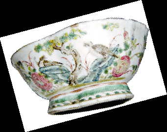第二件瓷器亦是同時期的同品種器物,底部也有典型的松綠地,是菱花口碗(亦稱葵瓣口碗),是民間的普通實用品。由于畫工沒有第一件瓷器精細,因此價值一般。