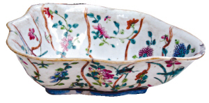 同治光緒年間多生產(chǎn)這種類型的“博古碟”,碟口有荷葉形、方形、橢圓形、菱形等,如碟中有花紋圖案的,多為擺設品或祭器;而碟中沒有任何花紋即可能是用于盛放食物的食器,其中有9件成一套的“九子碟”,一般是大戶人家在喜慶或宗族聚會時使用的餐具。廣東民間使用的“燒鵝碟”也是出于該年代的同品種瓷器,碟口為菱形,但碟身不深且平整。