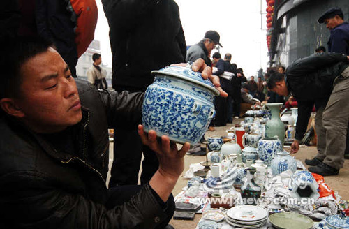 一位古玩專家告訴記者,這個(gè)古玩市場(chǎng)每個(gè)周日早上5點(diǎn)多種就開(kāi)始,一直持續(xù)到中午12點(diǎn),成交情況也比較火爆。圖為一淘寶者在仔細(xì)鑒賞一青花陶瓷。首席記者袁征攝