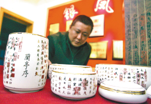 重慶大仁公司董事長凌峰說,這套文房四寶由筆筒、筆架、筆洗等組成,在該套文房四寶的筆筒、筆洗上燒有我國著名書法家王曦之的《蘭亭序》全文真跡,字體用純金臨摹。業(yè)界人士說,該套文房四寶具有較高的觀賞、收藏價(jià)值。