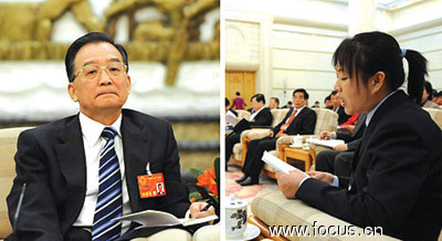來自廣東佛山的農(nóng)民工代表胡小燕發(fā)言(右圖)時(shí)說:“農(nóng)民工最關(guān)心的事情就是擔(dān)心留在家鄉(xiāng)的孩子每天是不是吃飽了飯,穿暖了衣,上學(xué)的路上是不是安全……”,溫家寶總理聽胡小燕發(fā)言時(shí)表情凝重(左圖)。聽完胡小燕的發(fā)言,溫家寶總理說:“你關(guān)心的問題,也是我關(guān)心的問題。”