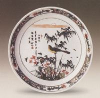 說 明: 此盤裝飾上突出用黑彩,紅、黃、綠、紫作點(diǎn)綴,構(gòu)圖舒展,筆法率意,色彩絢麗,詩與畫相配,相得益彰.