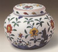 說(shuō) 明: 此罐是以明代成化斗彩花蝶紋罐為藍(lán)本仿燒而成.