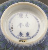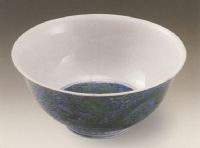 說 明: 胎質(zhì)堅(jiān)細(xì),胎壁較薄,能光照見影.紋樣線條流暢,青花濃淡不一,有水印痕,綠彩鮮艷明亮.