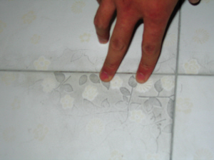 據(jù)何鐵柱敘述,裝修的時候,為避免地磚被硬物劃傷,他曾用廢紙箱蓋在地磚上,勾地磚縫時,便發(fā)現(xiàn)有些地磚花了,就像被磨漏后沾了臟東西。因為還沒有裝門、吊頂、櫥柜及燈具,所以他又用廢紙箱將地磚保護起來。可等到吊頂裝完后,他發(fā)現(xiàn)花的地磚更多了,也花得更厲害了。