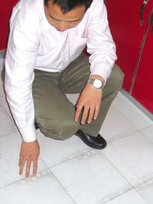 起初,何鐵柱以為是自己一次無意且錯誤的清潔造成的。“那天工人在清潔廚房地磚縫,我想磚縫挺黑的,就想拿鋼絲球擦一擦,剛擦了一小會兒,工人馬上制止了,說鋼絲球會破壞瓷磚釉面,我一看,果然剛擦的地方就花了,黑黑的。”但那次只擦了10厘米左右,此后何鐵柱也不敢再用鋼絲球清潔地面,但瓷磚變臟、發(fā)花的情況卻越來越嚴(yán)重,于是他推翻了自己最初的想法。