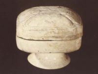 說 明: 盛化妝品的器皿.胎薄,白而細(xì)膩,白釉泛青或泛黃.器底刻一"官"字,實(shí)屬少見.器形仿自金屬盒.