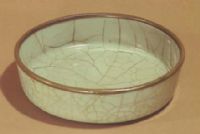 說 明: 青釉.內(nèi)底印凸花龍紋,因釉汁肥厚,紋飾不清晰,洗口釉薄并鑲有銅口.此盤在傳世官窯中極為珍貴.