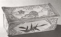 說 明: 白釉地繪黑褐色彩.題行書"明道元年巧月造,青山道人醉筆于沙陽".底部有"張家造"戳記.器形質(zhì)樸大方,紋飾簡(jiǎn)潔明快,是國內(nèi)僅存的一件磁州窯書紀(jì)年款枕.