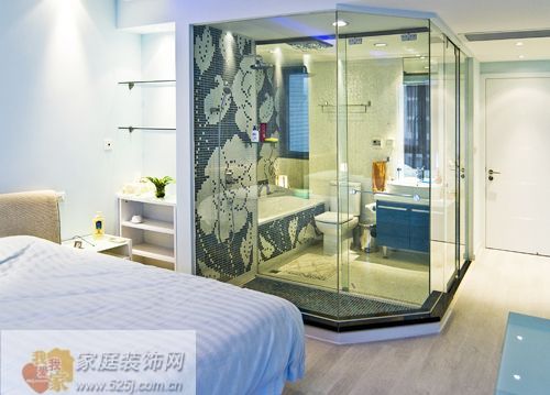 臥室里采用了兩個(gè)空間合并設(shè)計(jì),使空間看起來很寬闊。這樣的合并使空間看起來更像個(gè)套房,其實(shí)在這個(gè)繁忙的現(xiàn)代都市里生活,越來越多的人注重生活品質(zhì),喜歡有自己的獨(dú)立空間和隱私,那么,這樣的的套房式的設(shè)計(jì)就再適合不過了。室內(nèi)空間采用以白色為主色調(diào),沒有有多余的設(shè)計(jì),大量的空間留白,使空間更耐看更容易軟裝色彩搭配。主衛(wèi)采用了玻璃做裝飾門,透明的玻璃使空間看起來更明亮,在放熱水的時(shí)候氣霧在玻璃上的朦朧感覺也很美。浴室整體采用了拼花馬賽克使空間看起來既個(gè)性又時(shí)尚。主衛(wèi)與主臥采用了一樣的淡雅色系,整個(gè)空間看起來很協(xié)調(diào)。在臥室與主浴的一個(gè)空隙間,設(shè)計(jì)師還做了個(gè)擺設(shè)架這不僅使空間看起來更充實(shí)也美化的角落空間,下面的柜子還是很實(shí)用的,平時(shí)可以放些小東西。其實(shí)這樣的設(shè)計(jì)非常適合現(xiàn)代都市白領(lǐng)們,平日里厭倦了喧鬧聲回家了就更渴望有一個(gè)獨(dú)立的空間讓自己呆會(huì),而這樣的色調(diào)與設(shè)計(jì)就再適合不過了。