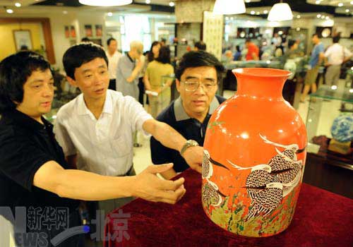 6月28日,觀眾在北京合璧興陶瓷藝術館參觀景德鎮(zhèn)陶瓷學院教授的藝術作品。景德鎮(zhèn)陶瓷學院教授在展覽現場向陶瓷藝術愛好者和收藏者介紹青花、粉彩等陶瓷藝術專業(yè)知識,傳授陶瓷作品鑒賞方法。