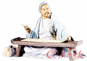 孫子盤(pán)膝而坐、著述兵法。在石灣陶藝寫(xiě)實(shí)與夸張的傳統(tǒng)手法基礎(chǔ)上,融入了現(xiàn)代西方解剖學(xué)的元素,以合理的身體語(yǔ)言來(lái)表現(xiàn)作品的思想情懷。