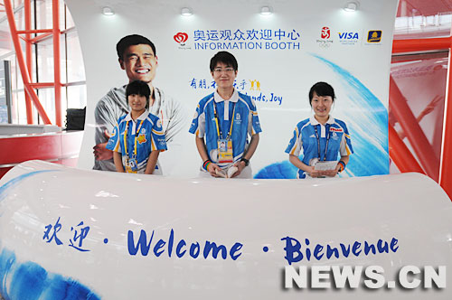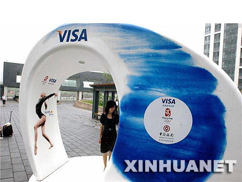 7月24日,在首都國際機場新落成的T3航站樓,靚麗的Visa"太極青花瓷"奧運觀眾歡迎中心已經(jīng)正式亮相啟用。新華網(wǎng) 尤亮 攝