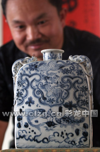 一騎戰(zhàn)馬馳騁在廣闊的草原上,一個(gè)大漢瀟灑地從馬背上的皮囊中拿出一個(gè)扁壺,豪邁暢飲……24日看到這個(gè)式樣獨(dú)特的元青花“四系扁壺”時(shí),一段珍藏的歷史就這樣自然地呈現(xiàn)出來(lái)。“四系扁壺”是云南省首件通過(guò)科學(xué)鑒定確認(rèn)的元青花,它是古人放在馬背上裝水、裝酒的特殊器物,而這個(gè)扁壺背后還背負(fù)著收藏界一個(gè)爭(zhēng)論不休的謎題。